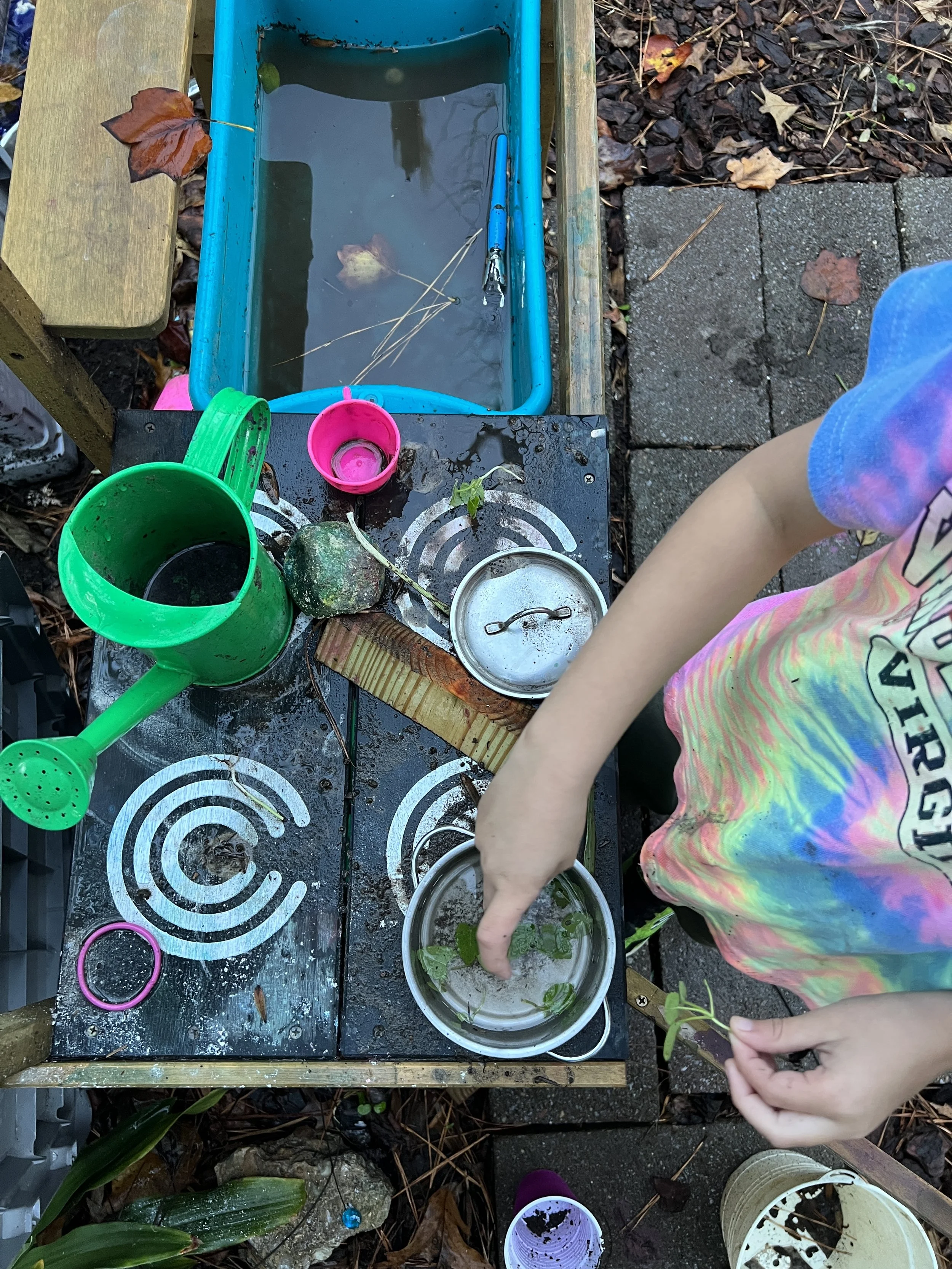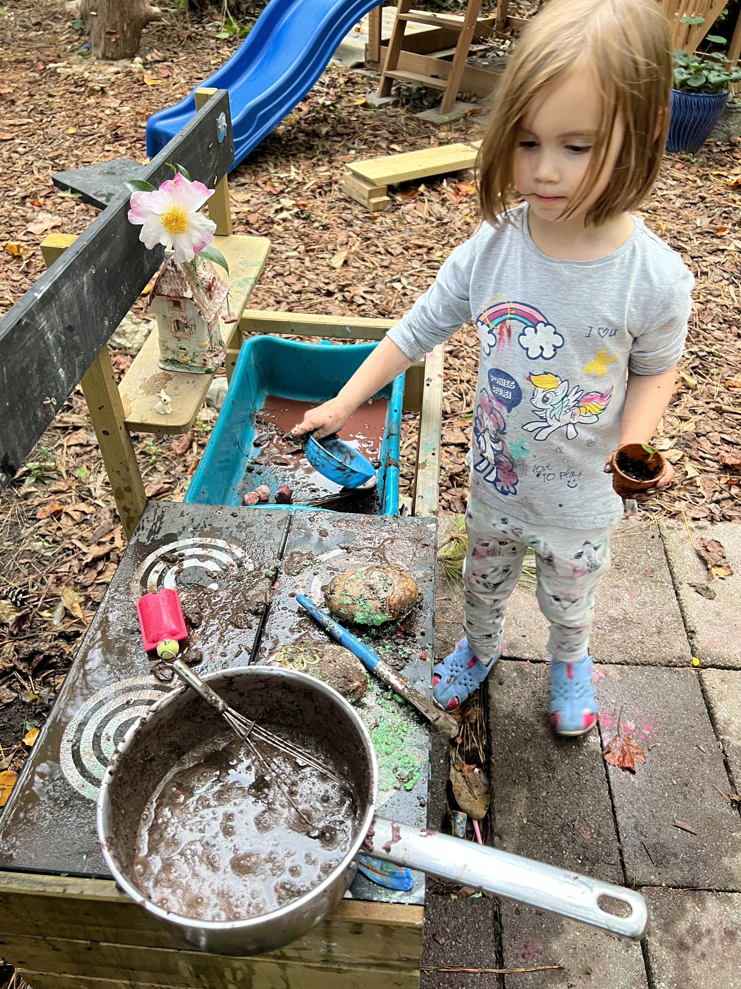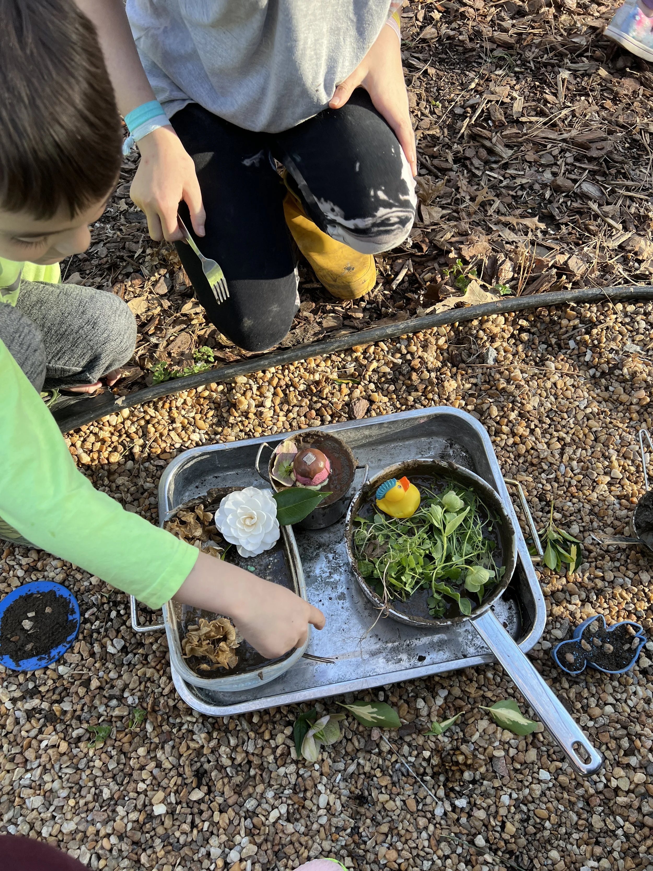 Use mud, leaves, and sticks to "cook" imaginative dishes, engaging in playful, sensory learning outdoors.