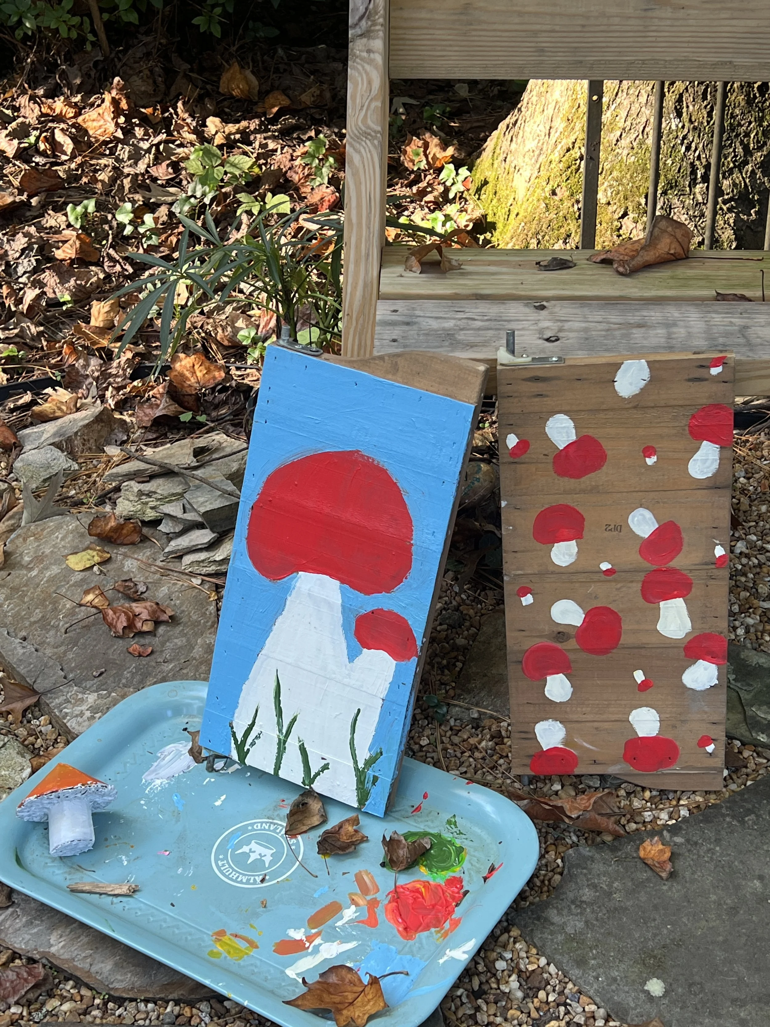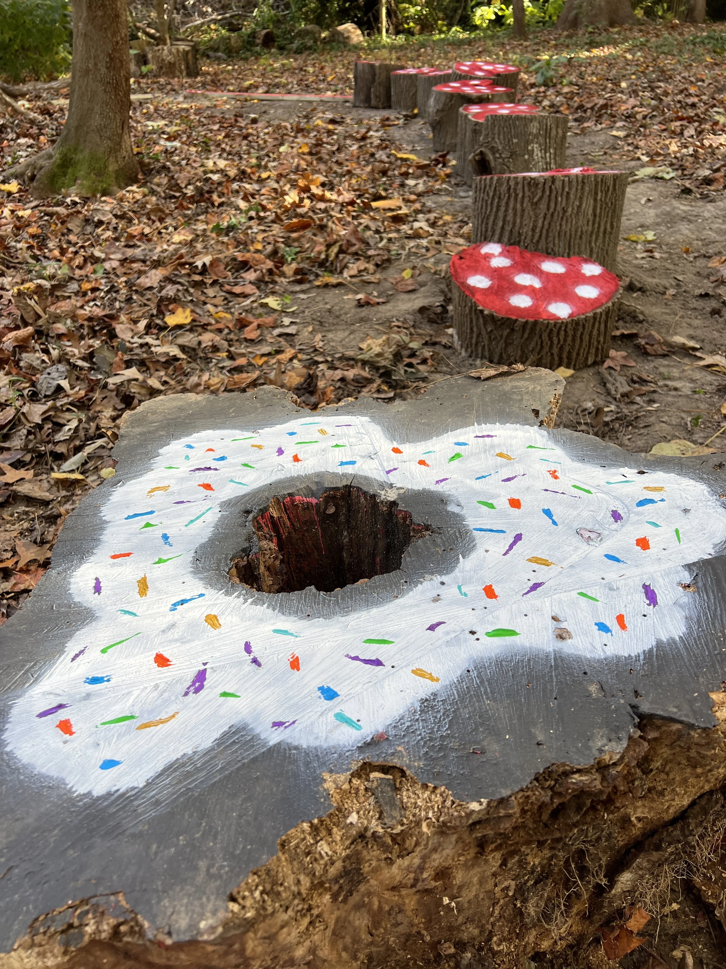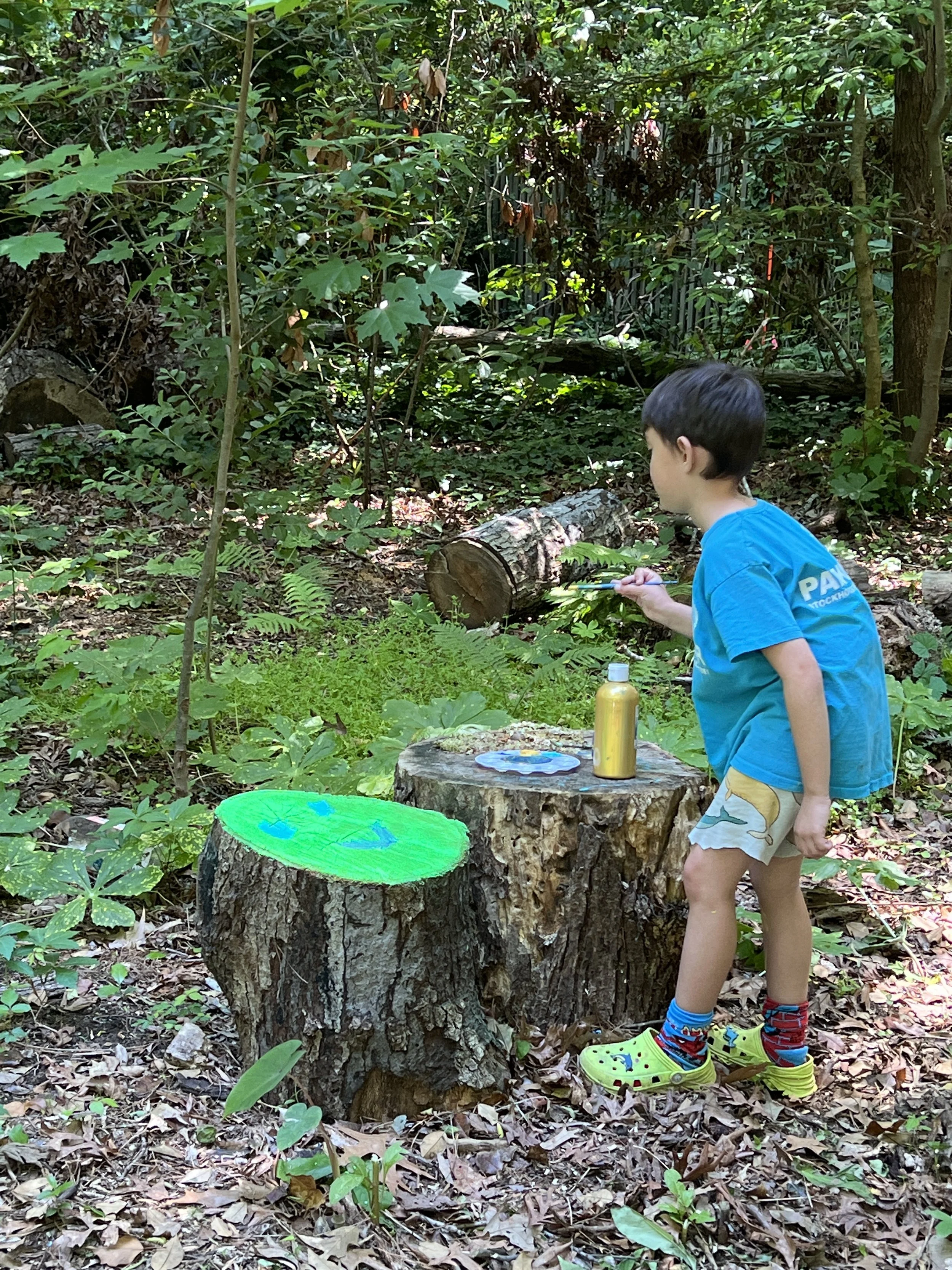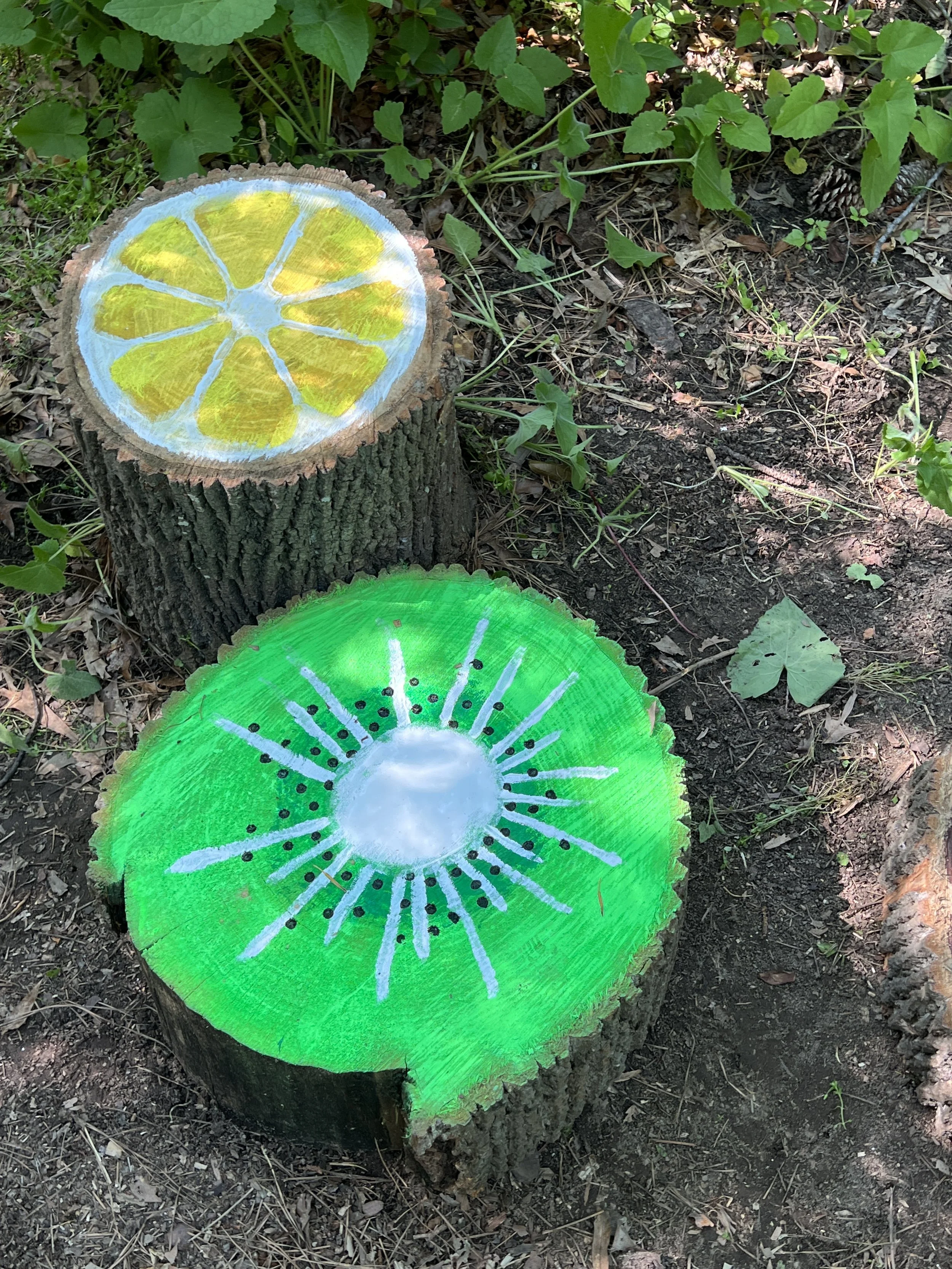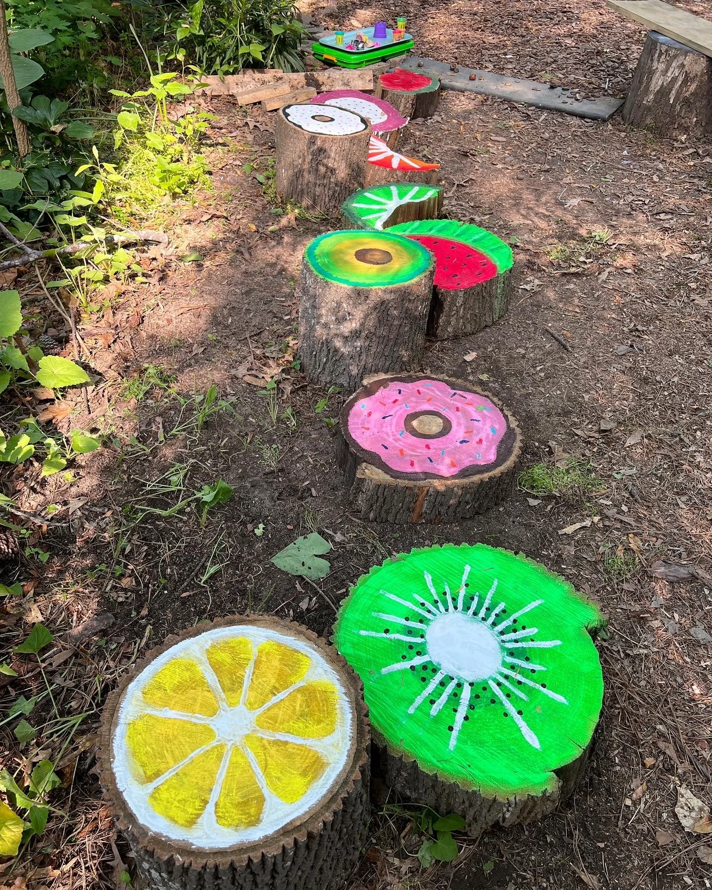 Transform tree stumps into colorful canvases, painting vibrant designs that blend creativity with the natural textures of the forest.
